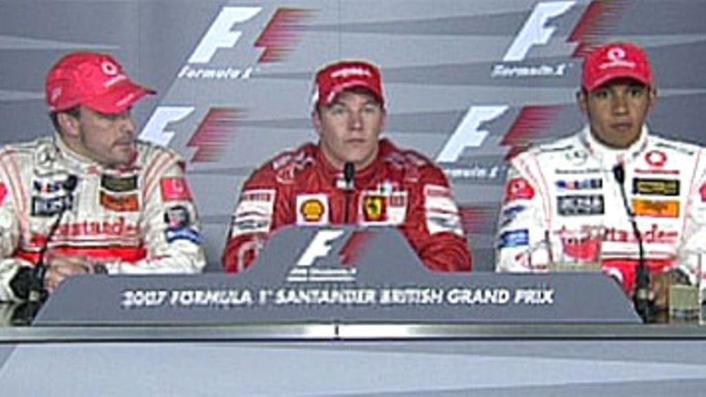 Paikalla Britannian GP:n kolme parasta kuljettajaa Kimi Räikkönen (KR), Fernando Alonso (FA) ja Lewis Hamilton (LH).