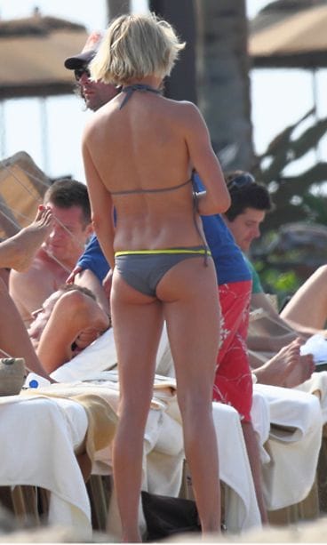 Hyväntuulinen Diaz viihtyi rantatuolissaan harmaissa bikineissä, jotka oli koristeltu keltaisin yksityiskohdin. Aurinkolaseihin sonnustautunut näyttelijätär ei ollut moksiskaan, vaikka kuvaajat olivat paikalla hänestä erityisen kiinnostuneita.