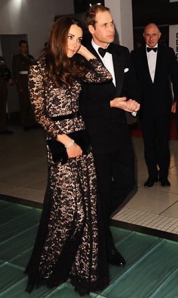 Catherine näytti tyrmäävän upealta kokopitkässä pitsipuvussaan. Mustin kukin ja lehdin kirjaillussa puvussa oli kapea, musta samettinen vyö, sekä syvään uurrettu pääntie niin edestä kuin takaa. Malli oli vyötärölle asti ihoa myötäilevä ja levenevä helma sai puvun näyttämään sulavalta. 3/4-pituiset hihat paljastivat Catherinen käsivarret ja toiseen ranteeseen kaunotar olikin sujauttanut hopeisen rannekorun – pitäen päähuomion iltapuvussaan.
