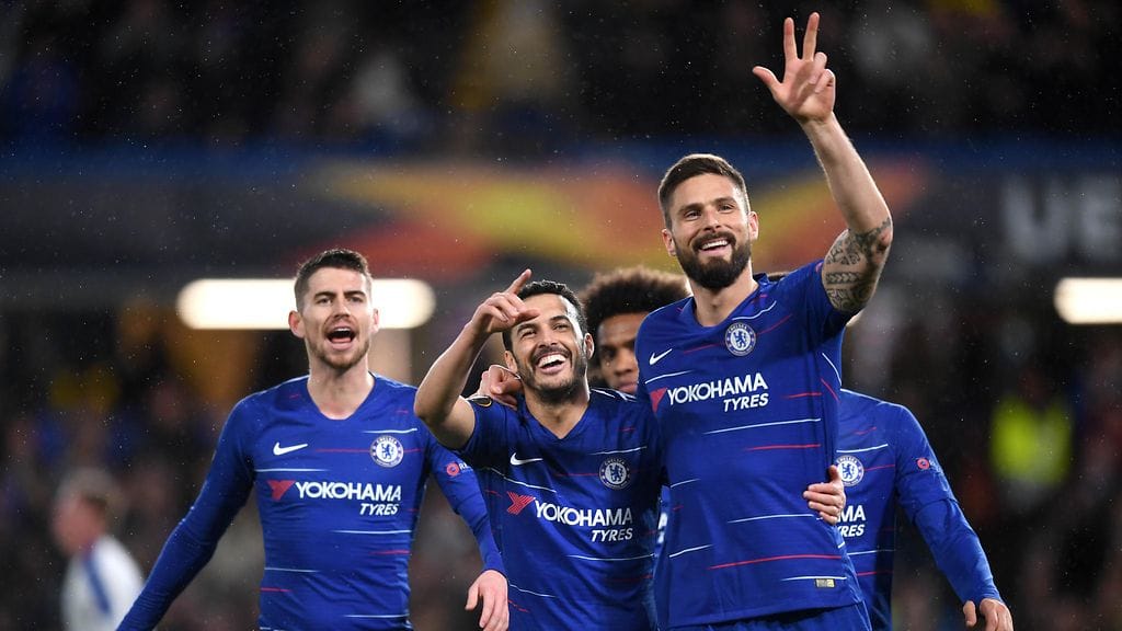 Olivier Giroud ja Pedro juonivat Chelsean 1-0-johtoon jalkapallon Eurooppa-liigan neljännesvälierien avausottelussa Dynamo Kiovaa vastaan torstaina.