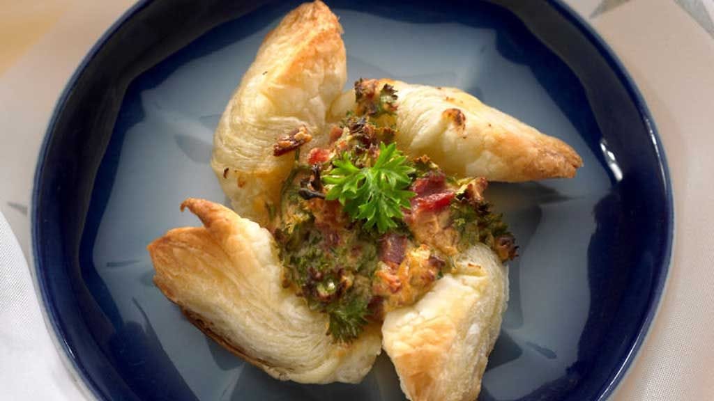 Levitä taikinalevyt leivinpaperille uunipellille ja anna niiden sulaa n. 15 minuuttia. Kaaviloi sulaneita levyjä hieman pidemmiksi, 21 cm pituisiksi. Jaa jokainen levy kolmeksi 7 x 7 cm neliöksi. Tee neliöiden kulmiin vinot viillot kohti tortun keskustaa (puoleen väliin). Nosta joka toinen kulma ylös ja nipistä ne keskelle alas painaen suppuun.