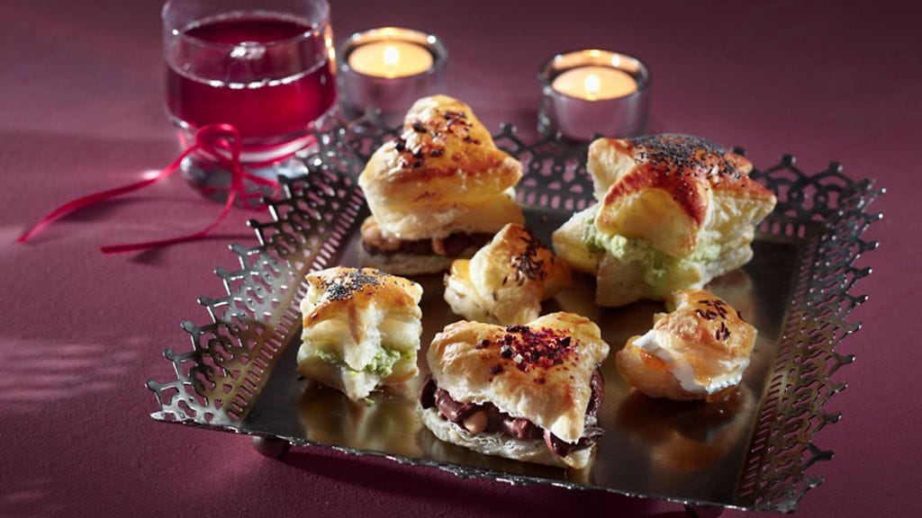 Suolapähkinä-suklaamoussesydämet, Avokadotähdet ja Viikuna-juustokuut maistuvat pikkujoulujen tarjottavana.