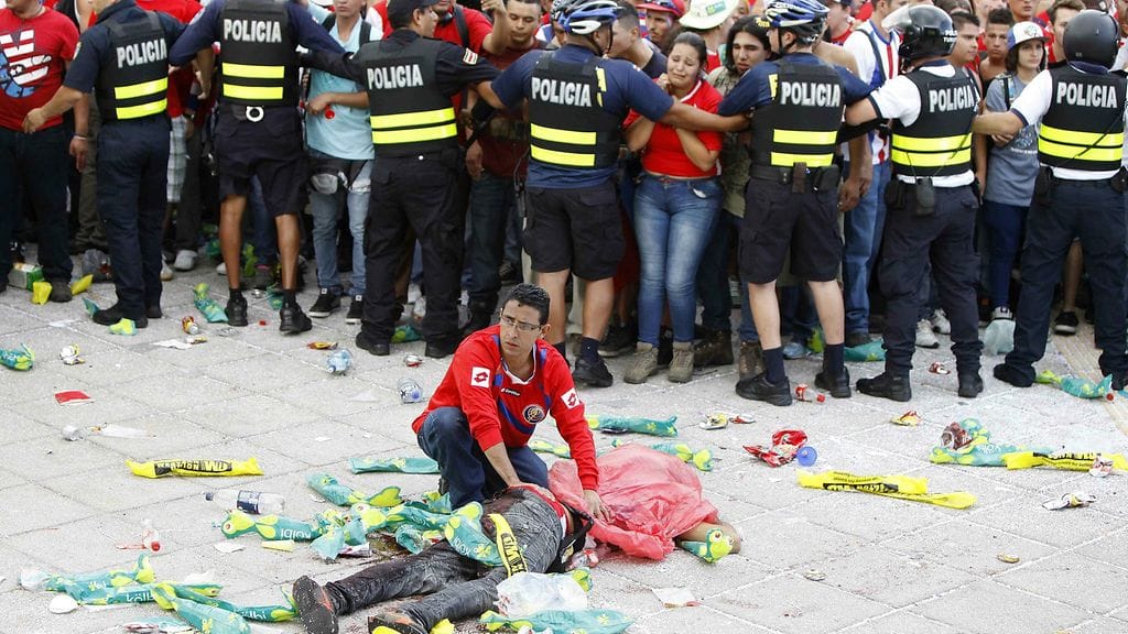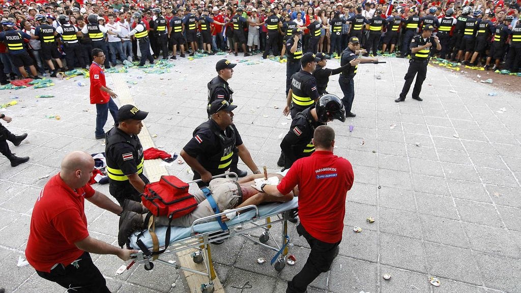 Costa Ricassa useita ihmisiä loukkaantui, kun MM-jalkapalloa aukiolla jättiscreenilta seuranneen yleisön keskuudessa puhkesi tappelu.