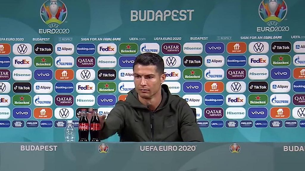 Ronaldo siirsi kolapullot syrjään lehdistötilaisuudessa maanantaina, ja kehotti paikalla olijoita juomaan vettä. Tällä oli huomattava ja välitön vaikutus Coca-Colan pörssikurssiin.