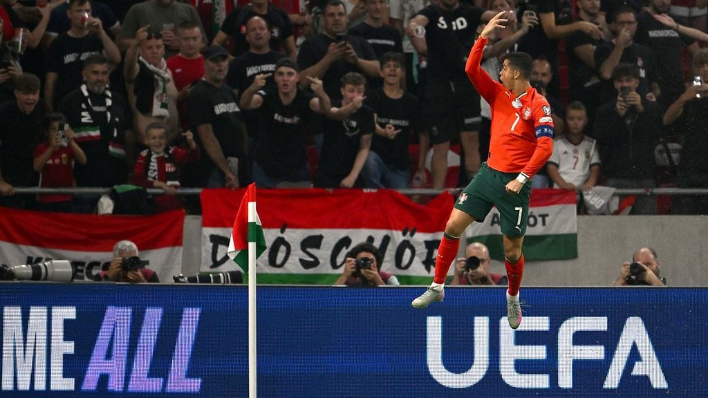Portugalilainen jalkapallolegenda Cristiano Ronaldo nousi tiistaina jakamaan yhtä kansainvälisen jalkapallon ennätystä, kun hän viimeisteli osuman Portugalin 3–2-vierasvoitossa Unkarista MM-karsinnassa.