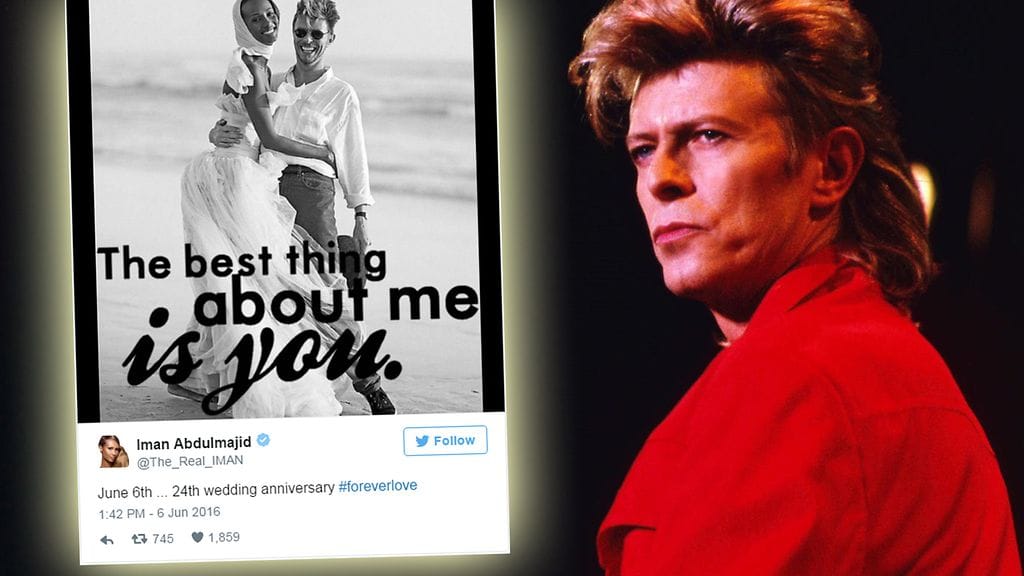 Kesäkuun 6. päivä oli Imanin ja Bowien hääpäivä. Kuvassa on koskettava teksti "Parasta minussa on sinä". Twiitissä on mukana myös liikuttava Ikuinen rakkaus -aihetunniste.