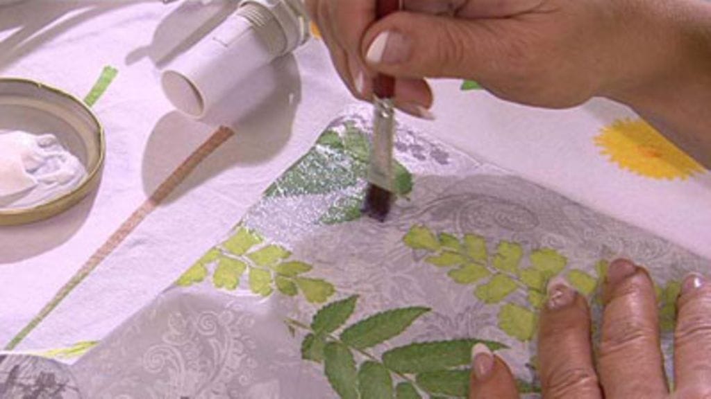 Varmista että valaisimen pinta on puhdas. Ota lautasliinan painettu päällimmäinen kerros ja aseta se lasivalaisimen päälle. (Jos haluat erillisiä kuvioita, kuten perhosia, leikkaa ne huolellisesti irti lautasliinasta ja aseta valaisimen pinnalle.)