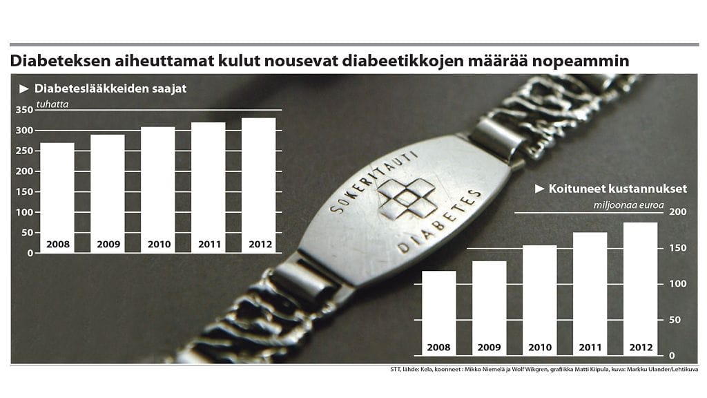 Viime vuonna Kela maksoi diabeteskorvauksia 175 miljoonaa euroa. Tänä vuonna korvaussumma voi nousta lähelle 200 miljoonaa euroa, koska diabeteslääkkeiden saajien määrä nousee tasaisesti.