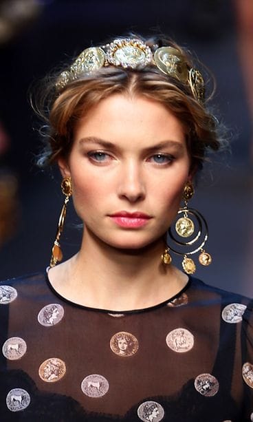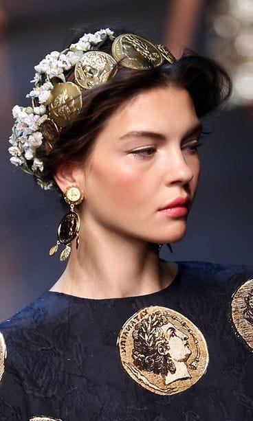 Muotitalo Dolce & Gabbana koristeli kevät-kesä 2014 -mallistoaan esitellessään malliensa hiukset vanhahtavin roomalaiskampauksin ja -koruin. Hiuksissa nähtiin niin kolikoita kuin kukkia. Myös mallien korvakorut olivat kuin vanhoista jumaltaruista.