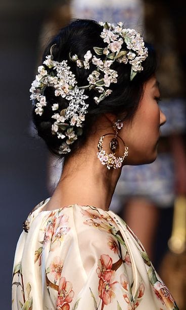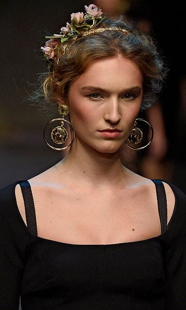 Italialainen muotitalo Dolce & Gabbana toi Milanon muotiviikoilla lavalle mallit, joiden hiukset oli koristeltu moderneiksi roomalaiskampauksiksi.