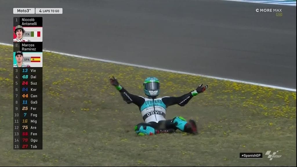 Nelosruudusta kisaan startannut Antonelli nousi Moto3-kauden pisteissä neljänneksi. Sarjaa johtanut KTM-kuski Jaume Masia keskeytti, joten kärkeen nousi toinen espanjalainen KTM-kuski Aron Canet, joka oli sunnuntain kisassa neljäs.