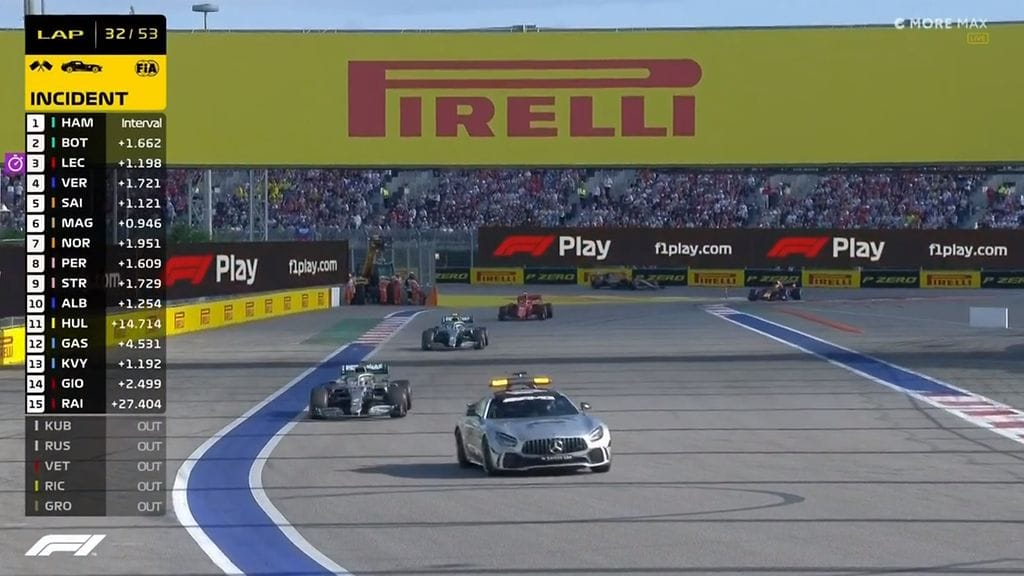 Molemmat Mercedes-kuskit menivätkin virtuaalisen turva-auton aikana varikolle. Samalla Hamilton onnistui nousemaan jo aiemmin varikolla käyneen Ferrari-kuskin eteen kärkeen.