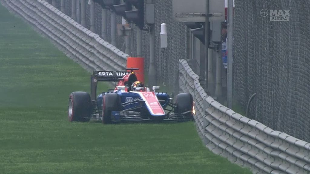 Manorin tulokaskuski Pascal Wehrlein puolestaan lähti heti liikkeelle superpehmeillä kumeilla, mikä kostautui. Pääsuoralla oli iso lätäkkö, ja Wehrlein avasi juuri avattavan takasiiven. Suoralla oli myös pomppu, jonka takia saksalainen menetti autonsa hallinnan ja kolautti voimalla ratareunukseen. Hän ei loukkaantunut, mutta aika-ajo päättyi etuajassa.