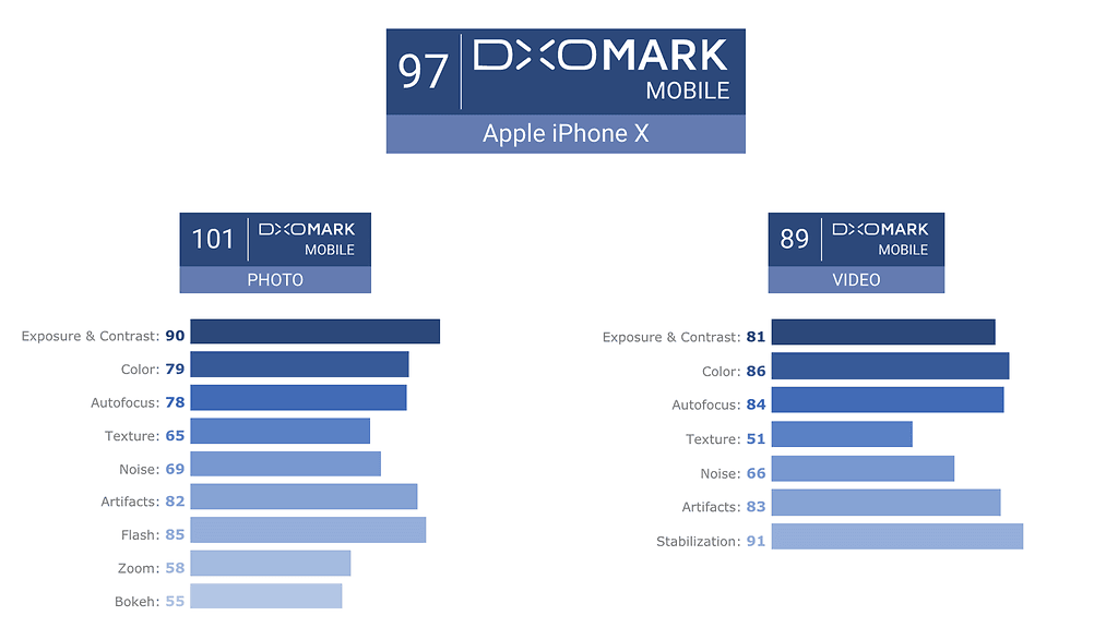 iPhone 8 sai aiemmin DxOMarkilta 92 ja iPhone 8 Plus 94 pistettä. Verrattuna iPhone 8 Plussaan iPhone X:n kaksoistakakamerassa on optinen kuvanvakain myös telelinssikamerassa, jonka aukon koko on myös suurempi (f/2,4 vs. f/2,8).