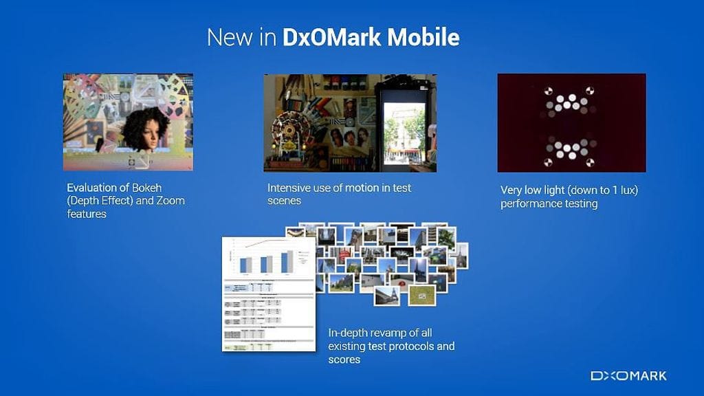 Uusi testikäytäntö huomioi ensi kertaa erikseen viime aikoina älypuhelimissa yleistyneet kaksoiskamerat. Uusina alaosioina mukaan tulevat kameroiden syvyysefektin sekä zoom-toimintojen testaus. Lisäksi DxOMark uudistaa kameratestikokonaisuuttaan huomioimaan liikkuvien kohteiden kuvaamisen sekä kuvaamisen erittäin alhaisessa, 1 luksin valaistuksessa.