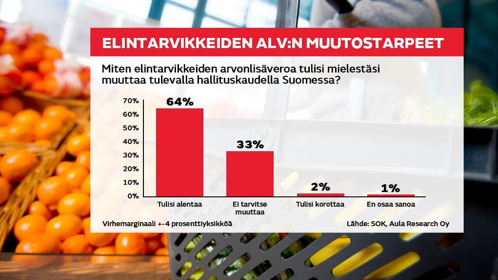 Tätä mieltä oli 64 prosenttia Suomen Osuuskaupan tuoreeseen kyselyyn vastanneista eduskuntapuolueiden kansanedustajaehdokkaista. 33 prosenttia vastanneista pitäisi alv:n ennallaan ja vain pari prosenttia kiristäisi.