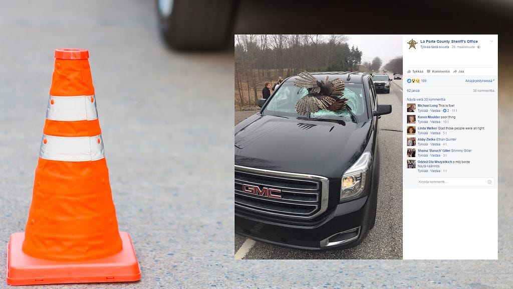 Tuulilasista tupsahti sisään lähes 14-kiloisen kalkkunan pää. Lintu jäi jumiin lasiin ja sen yritykset päästä vapaaksi olivat melko toivotonta katsottavaa. Autossa istuneet säikähtivät toki yhtäkkistä törmäystä ja saivat kahakassa tuulilasista irronneista lasinsiruista haavojakin, mutta eniten he järkyttyivät päästä, joka syöksähti lasin läpi.