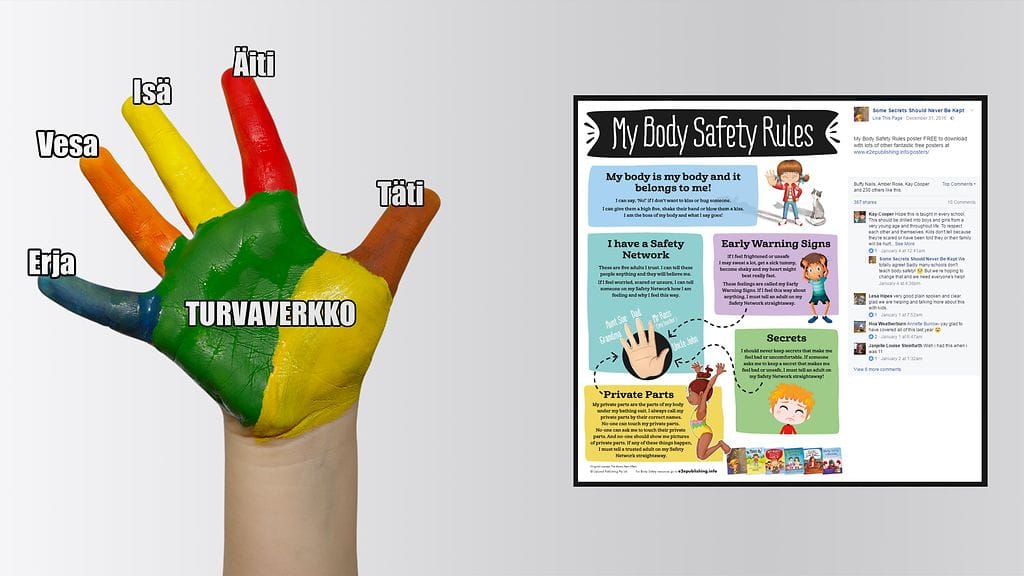 - Nämä viisi aikuista ovat sellaisia, joihin luotan. Voin kertoa näille ihmisille mitä tahansa, ja he uskovat sanaani. Jos tunnen oloni huolestuneeksi, pelokkaaksi tai epävarmaksi, kerron jollekin turvaverkkoni aikuiselle, miltä minusta tuntuu ja miksi minusta tuntuu siltä.