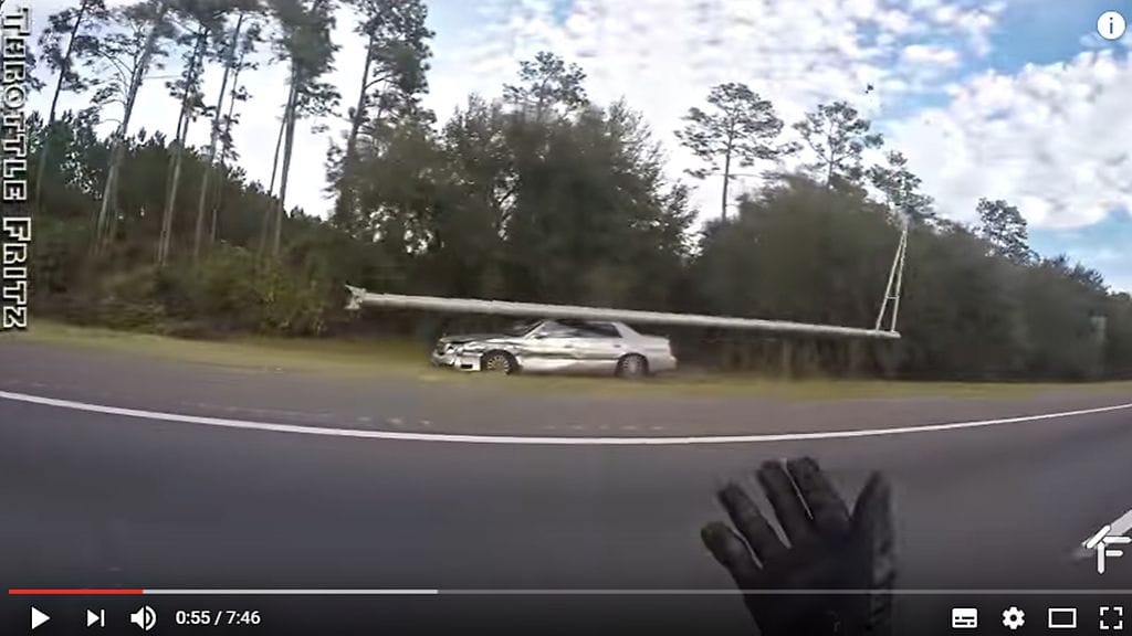 Moottoripyöräilevä videobloggaaja huomasi liikenteessä hortoilevan Cadillacin, joka oli vaurioitunut ja jossa oli rikkinäinen rengas. Auto ehti kaataa katuvalon ja törmätä betonivalliin ennen kuin se ajautui tienpenkkaan ja pysähtyi.
