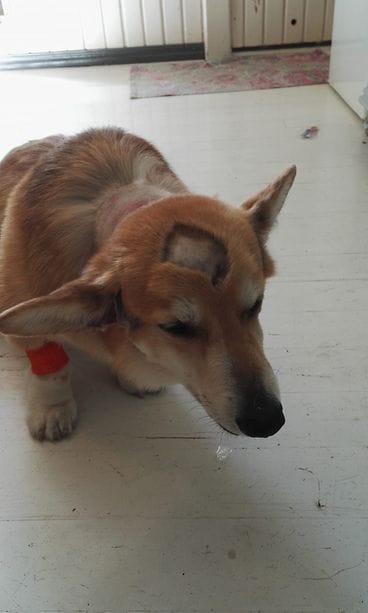 Taisto-koira sai yllättävän kesälookin, kun se kotona sattuneen pikkukahakan päätteeksi kävi eläinlääkärissä.