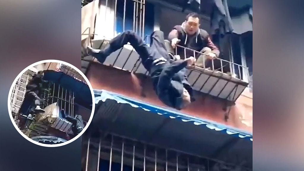 Kiinassa videolle tallentui dramaattinen tilanne, kun eläkeläismies roikkui parvekkeelta pää alaspäin. Mies oli juuttunut jalastaan kaiteeseen.