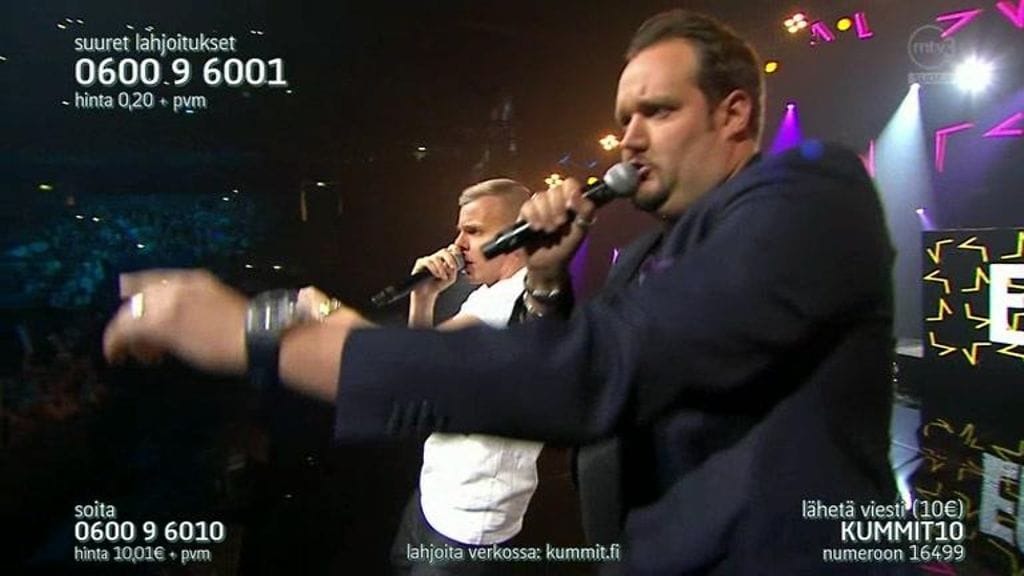 Ensin lavalle saapui iskelmälaulajakonkari Paula Koivuniemi ja sitten television puolella paremmin tunnettu koomikko Sami Hedberg.