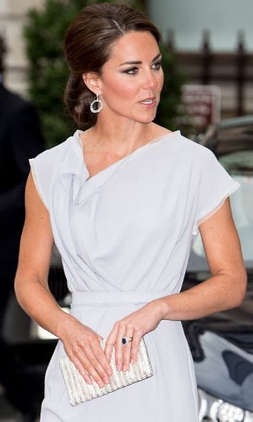 Englantilaisia muodinluojia suosivalla Catherinella oli tällä kertaa yllään serbialaisen suunnittelijan Roksanda Ilincicin luomus, jonka erikoinen kaulus kiinnitti huomion. Kaunislinjainen puku korosti herttuattaren hoikkaa vyötäröä. Korvissaan kaunottarella oli olympiahenkiset korvakorut.