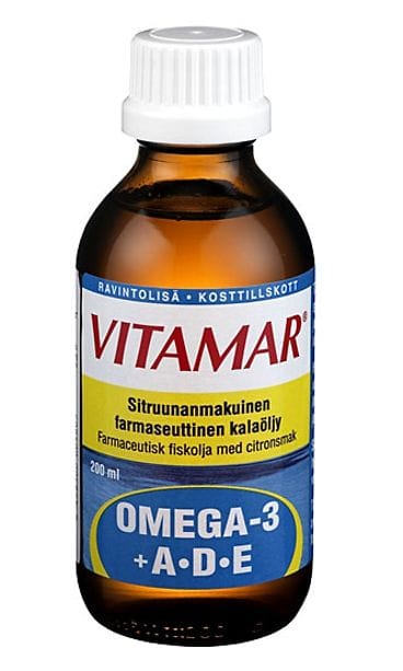 Sisältää runsaasti monityydyttymättömiä omega 3-rasvahappoja (EPA ja DHA). Vuorokausiannos (10 ml eli 2 tl) sisältää Omega-3 rasvahappoja 3,2 g: EPAa 1780 mg ja DHAa 1210 mg sekä arvokkaita rasvaliukoisia A-, D- ja E-vitamiineja. Vitamar kalaöljyyn on saatu miellyttävä sitruunanmaku luontaisesta sitruunaöljystä. Pakkauskoot 200 ml ja 500 ml.