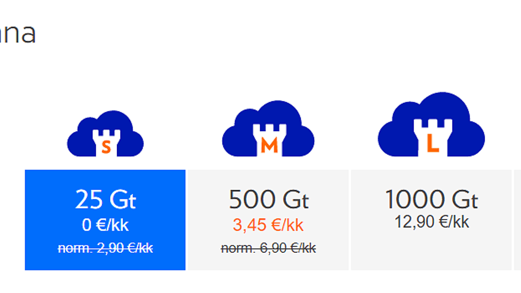 Pilvilinnan uusi versio tulee myös edullisemmalla hinnalla ja eri tallennustilavaihtoehtoina, jotka on listattu alla. Tarjolla on myös nyt 6 kuukauden tarjoushintana ilmaiseksi 25 gigatavua tai 3,45 eurolla kuukaudessa 500 gigatavua pilvitallennustilaa.