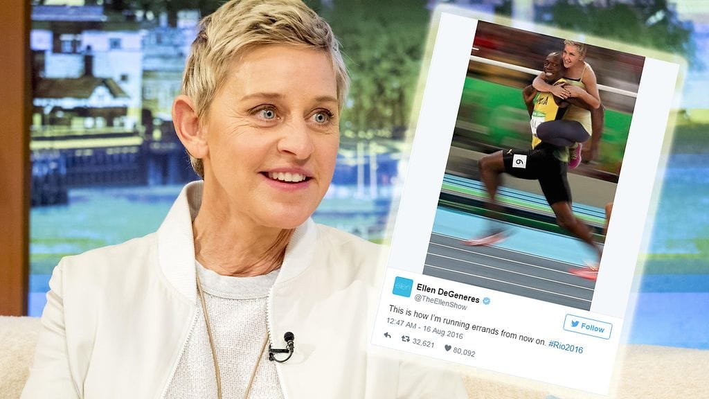Juontaja-koomikko Ellen DeGeneres julkaisi meemin, jossa hänet on kuvamuokkauksen avulla liitetty huippujuoksija Usain Boltin selkään.
