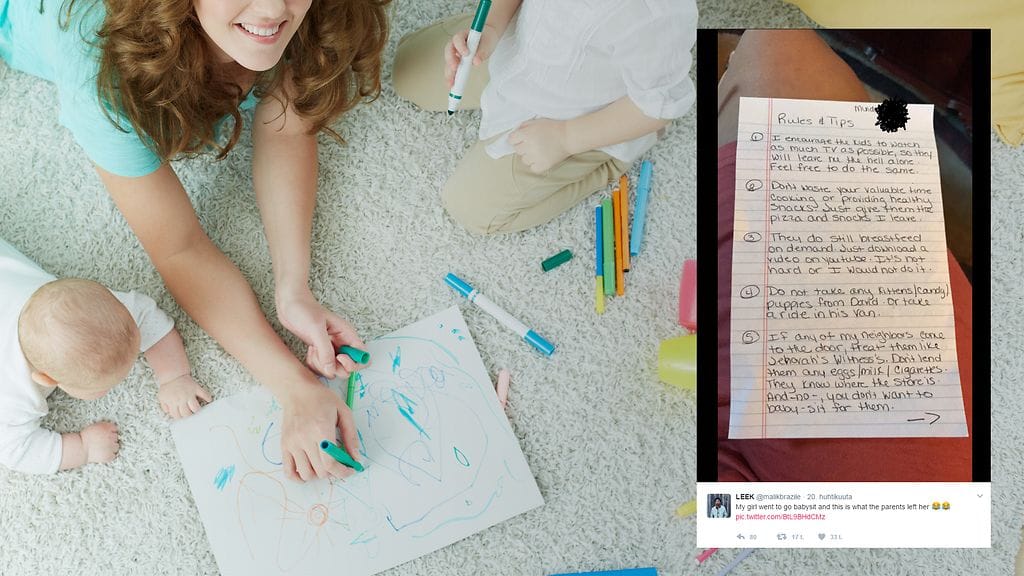 Huvittuneen poikaystävän jakama kuva lastenvahdin ohjeista sai kymmeniä tuhansia tykkäyksiä.
