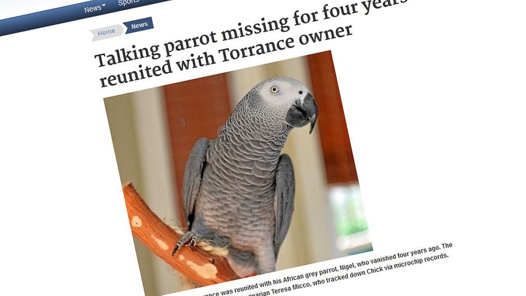 Kalifornialainen Daily Breeze -lehti kertoo, että brittiläisellä aksentilla puhunut Nigel-papukaija oli kadonnut omistajaltaan neljäksi vuodeksi.