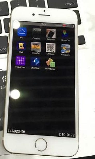 Näytöllä kuvan iPhonessa nähdään Applen sisäisesti käyttämien testiohjelmistojen kuvakkeita. AppleInsider kertoo, että WiPASmini käytetään yhteyksien testaamiseen ja MesaCalia TouchID:n testaamiseen.