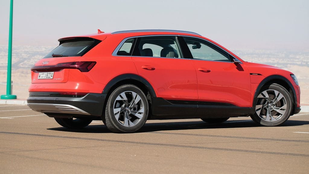 e-tron on helppo tunnistaa merkkinsä edustajaksi perinteisestä kahdeksankulmaisesta maskista lähtien. Muotokieli on aavistuksen konservatiivisempaa etenkin pokkausten suhteen verrattuna Audin muutamiin viime aikaisiin uutuuksiin. Kokonaisuus näyttää tasapanoiselta, eikä auto itse asiassa näytä yli 4,9 metriä pitkältä. Eniten huomiota e-tronin ulkonäössä herättää perinteisten peilien puuttuminen, sillä autoon on lisävarusteena tarjolla kameroilla toteutetut peilit.