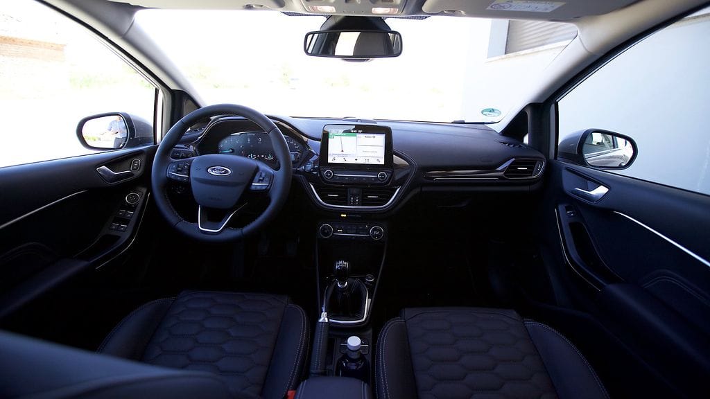 Sisätiloissa hallitsevan roolin ottaa varustetasosta riippuen joko 6,5- tai 8-tuuman kosketusnäyttö. Tämän kautta käytetään Fordin uusinta SYNC 3 -multimediajärjestelmää, ja samalla keskikonsolin painikkeiden määrää on vähennetty noin puolella. Fordin isompien mallien tyylistä poiketen kosketusnäyttö on tuotu lähemmäs kuljettajaa, eikä se ole upotettuna kojelautaan. Ratkaisussa puhutaan niin sanotusta kelluvasta ja tabletmaisesta näytöstä. Ergononomia kuljettajan paikalla on kokonaisuudessaan hyvä. Kuljettajalla on riittävät säätövarat ja autoon on helppo kotiutua.
