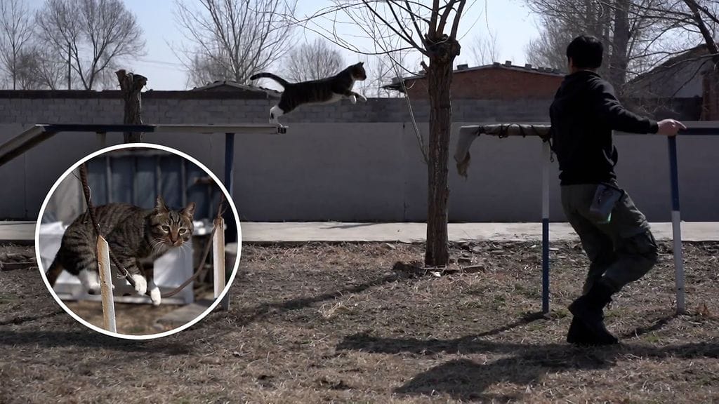 Kiinassa eläköitynyt sotilas on ottanut tehtäväkseen kouluttaa kissansa suorittamaan erikoisjoukkojen tehtäviä muistuttavia temppuja.