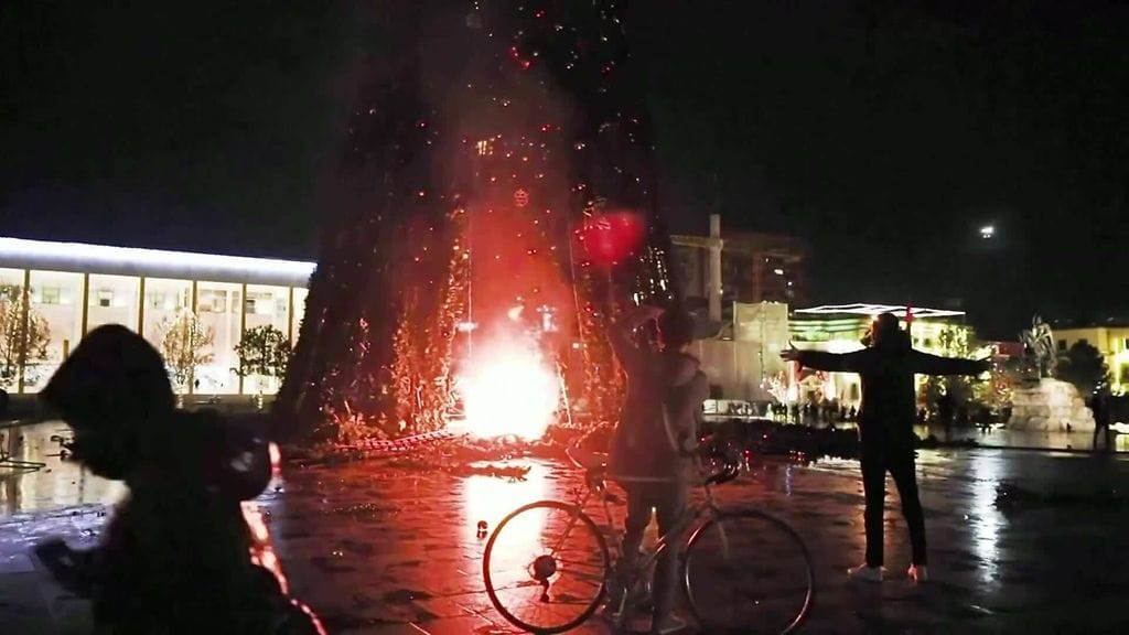 Videolla näkyy, kuinka mielenosoittajat polttavat joulukuusen ja ottavat yhteen poliisin kanssa.