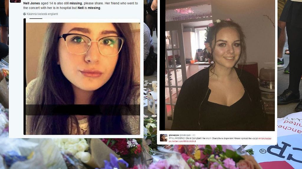 Vielä myöhään tiistai-iltana useita Manchester Arenan konsertissa olleita henkilöitä etsittiin sosiaalisen median avulla. Sanomalehti Telegraphin mukaan tiistai-iltana kateissa vahvistettiin olleen vielä 15 henkilöä.