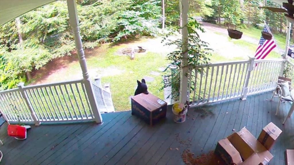 Koiranruokaa toimittavan yrityksen lähetti oli jättänyt murkinapaketin pennsylvanialaisen perheen kuistille. Perheen koirien sijaan paikalle oli kuitenkin ennättänyt ensimmäisenä karhu.