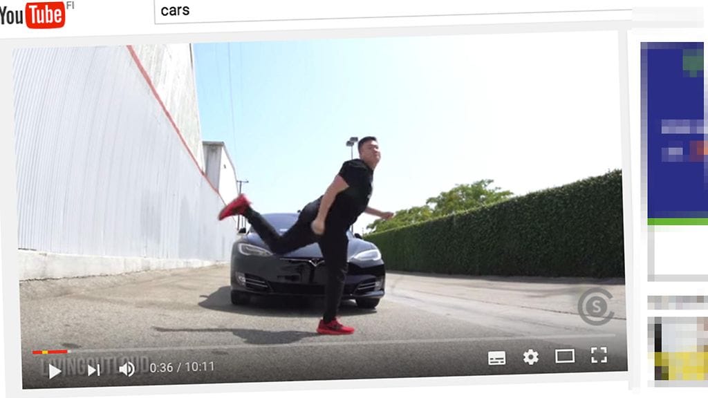 Herra kokeilee esimerkiksi Autopilot-ominaisuutta kirkuen, lastaa kuvaajansa Teslan takakonttiin ja kertoo, että autossa istutaan penkeillä ja että Teslassa on suuri näyttö.
