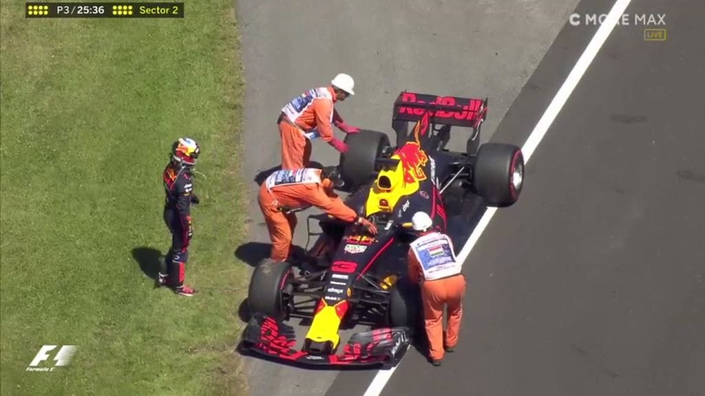 Eilen kärkiajat molemmissa harjoituksissa ajanut Ricciardo jäi kolmansissa harjoituksissa radan varteen vajaat puoli tuntia ennen ruutulipun heilahdusta. Tapahtumahetkellä Ricciardo oli ajanut harjoituksissa kolmanneksi nopeimman ajan.