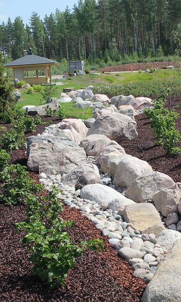 Jokainen puutarhan kivi on tarkasti alueelta valittu ja ne on aseteltu yksitellen paikoilleen reunustamaan 130 metriä pitkää puroa, joka laskee vetensä alueen kahteen hulevesien viivytysaltaaseen.