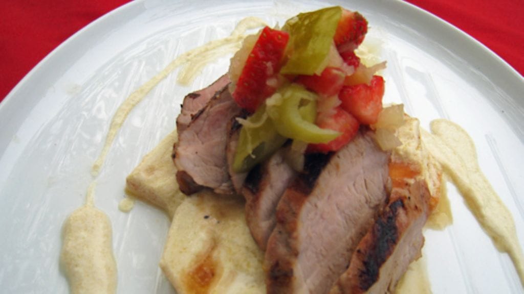 Leikkaa mansikat pikku kuutioiksi ja sekoita ne ananasmurskaan. Mausta valkosipulilla ja pepperoniviipaleilla.