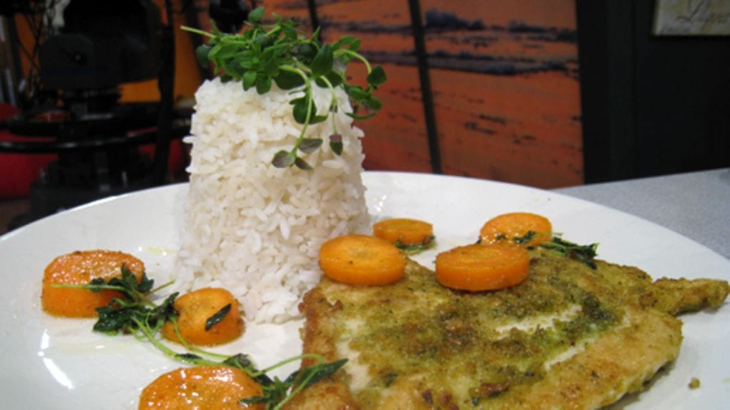 Murskaa basilika ja valkosipuli tehosekoittimella ja ohenna öljyllä. Sekoita korppujauhot yrttitahnan sekaan ja mausta suolalla. Nuiji broilerinfileet ohuiksi pihveiksi ja levitä yrttitahnaa niiden pinnoille. Paista leikkeet kypsiksi miedolla lämmöllä, tilkassa öljyä.