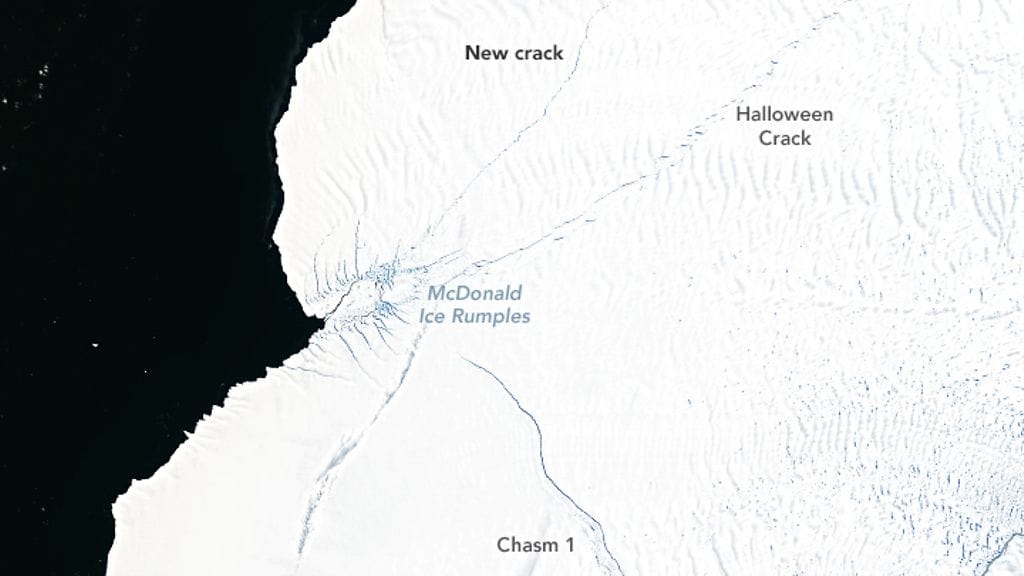Tutkijat seuraavat parhaillaan jäähyllyssä etenevää uutta railoa (New crack), joka saattaa johtaa jäähyllyn repeämiseen vielä ennen Etelämantereen kesäkauden päättymistä.
