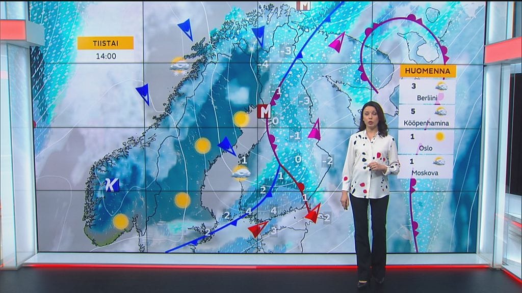– Pohjois-Suomi pysyy pilvisenä. Pakkaslukemat ovat siellä hyvin tasaiset, kertoo Rintaniemi.