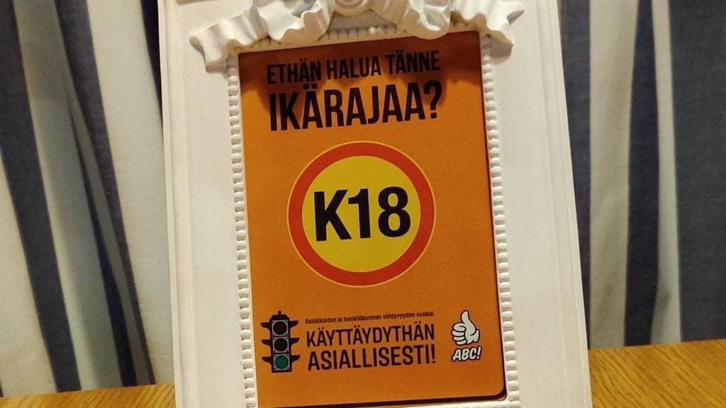 Kehystetyssä kyltissä lukee: "Ethän halua tänne ikärajaa? Käyttäydythän asiallisesti". Lisäksi kyltissä on keltapunainen K-18 kieltomerkki.