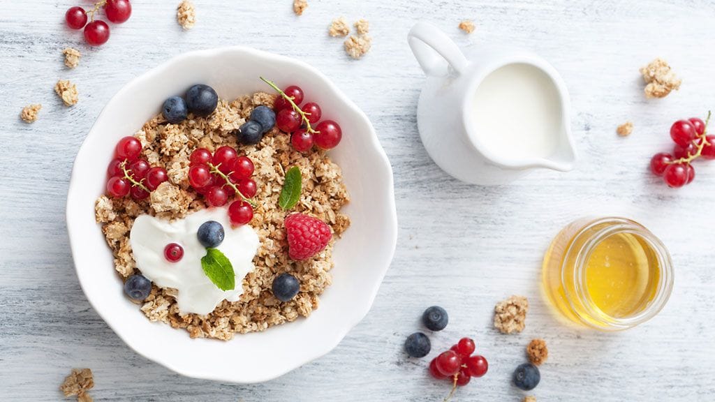 Täysjyvästä valmistetut murot tai hedelmät ovat hyviä aamiaisvalintoja, koska ne sisältävät paljon kuitua. Kuitu pitää sinut kylläisenä pidempään, jolloin riski naposteluun aamiaisen ja lounaan välillä pienenee. Riittävä kuitujen saanti estää myös vatsaasi turpoamasta, joten pallomahan sijaan sinulla on litteä vatsa.