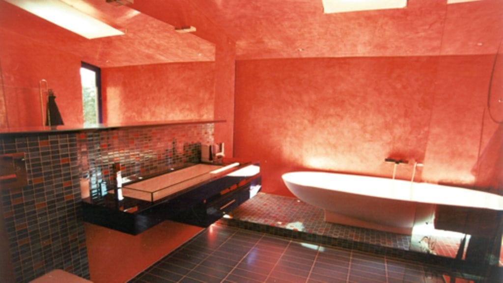 Kylpyhuoneen eksoottinen tunnelma syntyy eläväpintaisten, punaisten seinien ja tummien laattojen rohkeasta liitosta.