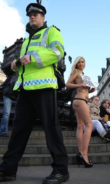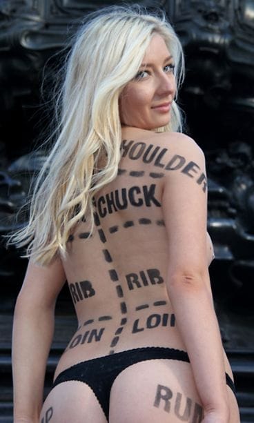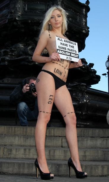 Euroopan seksikkäimmäksi tituleerattu Sophie Barret riisui kaikki vaatteet keskellä Lontoon katuja. Naisen alastomalle hipiälle oli kirjoitettu mustin kirjaimin, mistä löytyy mikäkin lihapala.